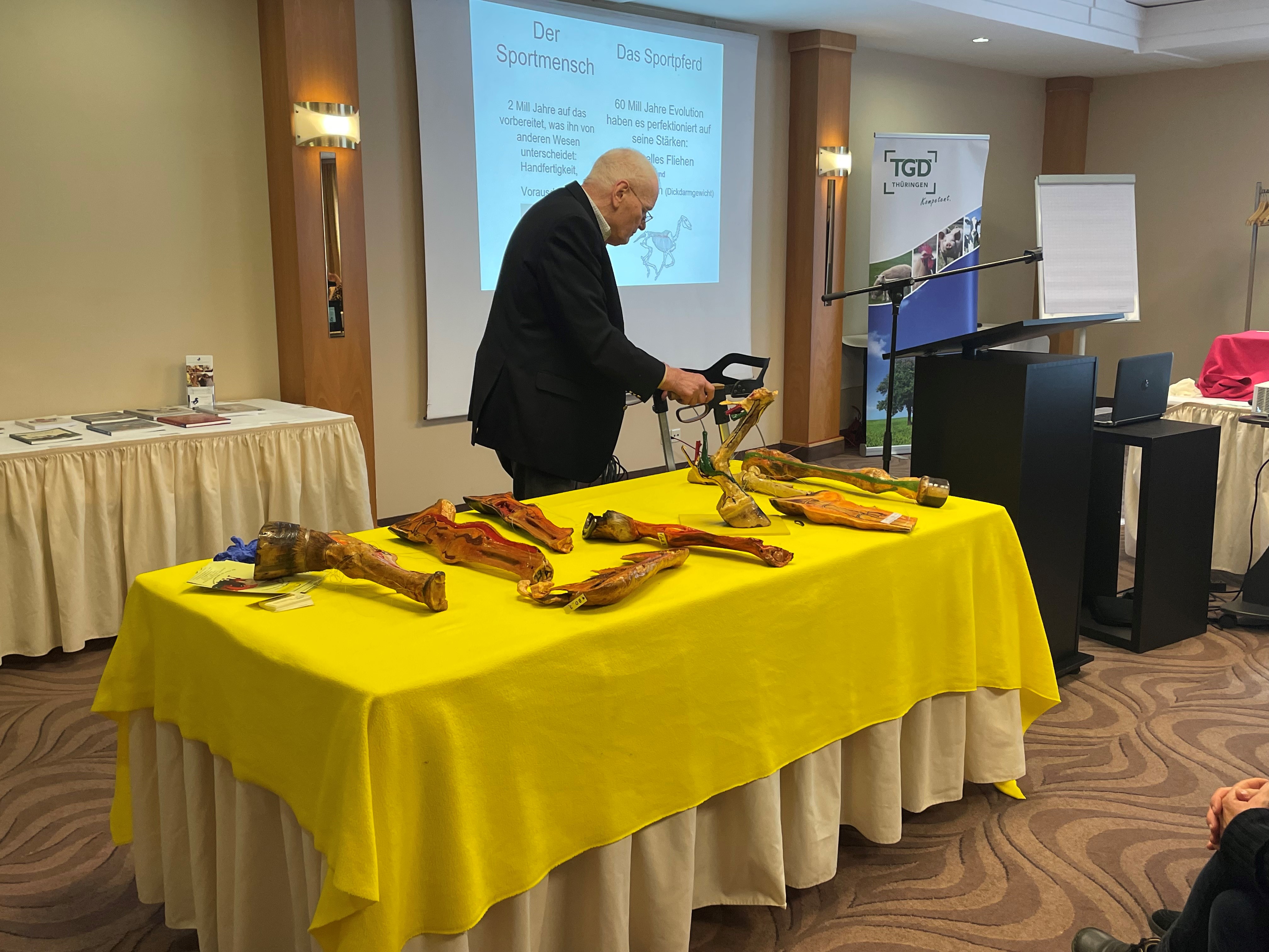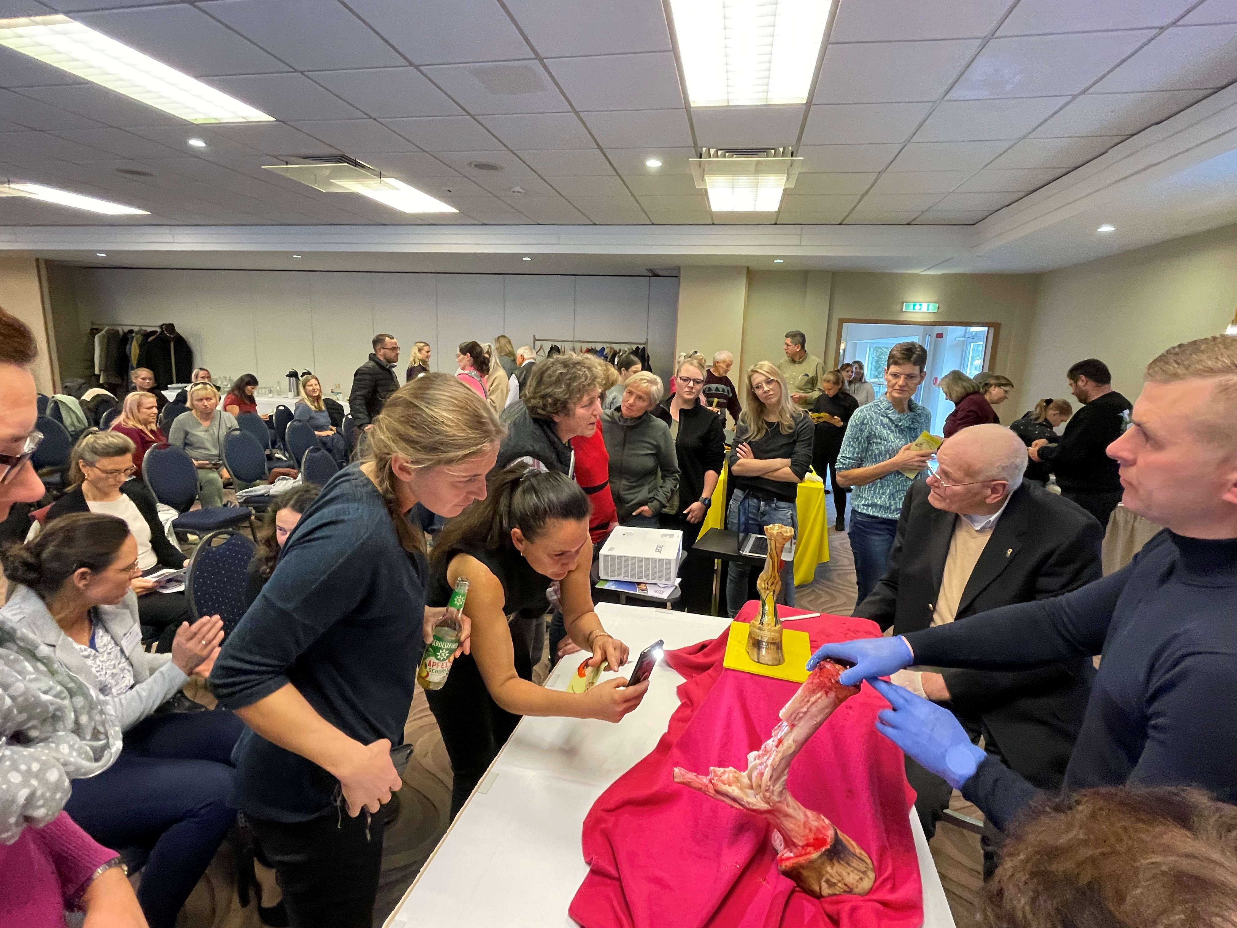 Der letzte Vortrag der Veranstaltung war dem sehr bekannten, hochgeschätzten Dr. Helmut Ende vorbehalten. Der mittlerweile weit im Rentenalter stehende Pferdetierarzt aus Isernhagen bot mit seinem Assistenten eine fantastische Vorstellung. Zunächst erläuterte er die Anatomie und Funktion der Pferdegliedmaße und erklärte, wie man Pferde lahmfrei erhält: „Viel Bewegung auf steppenähnlichem Geläuf“. Zur Anschauung brachte er einige seiner Exponate mit, welche von den Teilnehmern inspiziert werden konnten. Als Höhepunkt sezierte sein Assistent einen frischen Pferdefuß und stellte mit der Präparation von oberflächlicher/tiefer Beugesehne und M. Interosseus den Tragapparat des Fesselgelenkes dar. Ein Bereich, der häufig durch falsche Arbeit, Überlastung oder schlechten Hufbeschlag von Erkrankungen und Lahmheit betroffen ist.