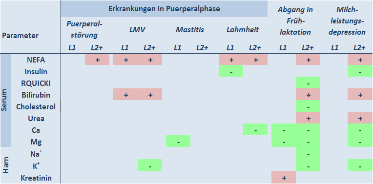 Tabelle: Präpartal gemessene Parameter in Serum oder Harn bei primiparen (L1) und multiparen (L2+) Kühen mit signifikanter Erhöhung (+) oder Verminderung (-) des Risikos für puerperale Erkrankungen, Abgänge oder Milchleistungsdepression